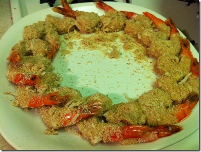 I butterfly-cut my shrimp by cutting them from end to tail. This let the whole area of the shrimp be coated. Leaving the tails on. It also gave me a good excuse to use the awesome new knife set I just purchased from Gilt.